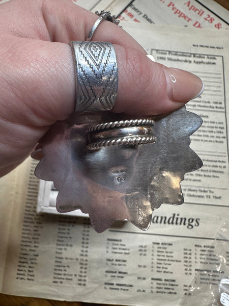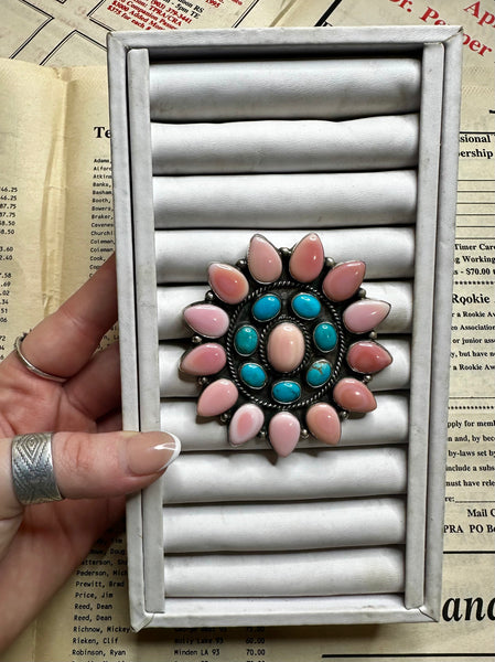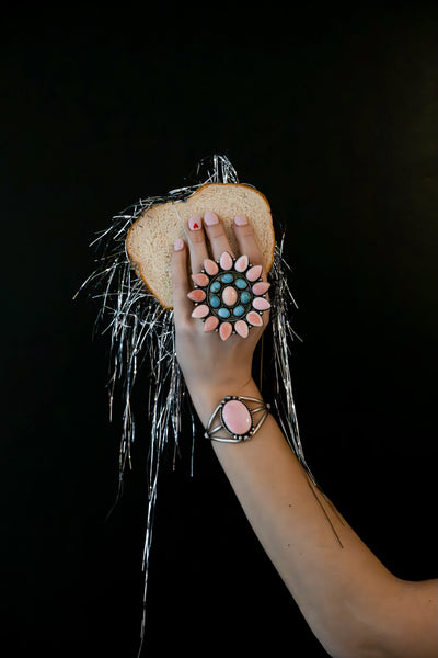 The Boaz is a big pink & turquoise cluster ring that is adjustable