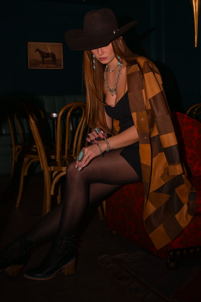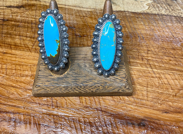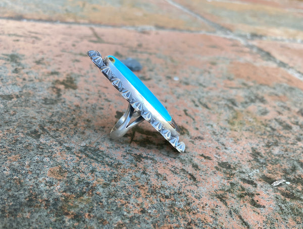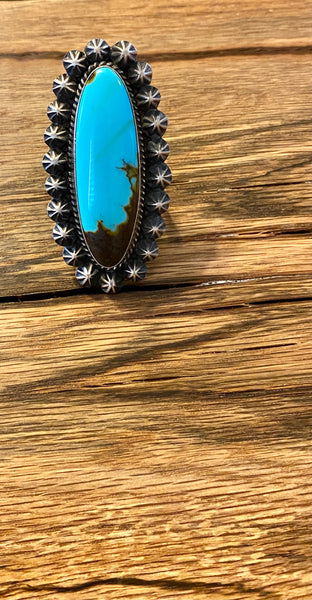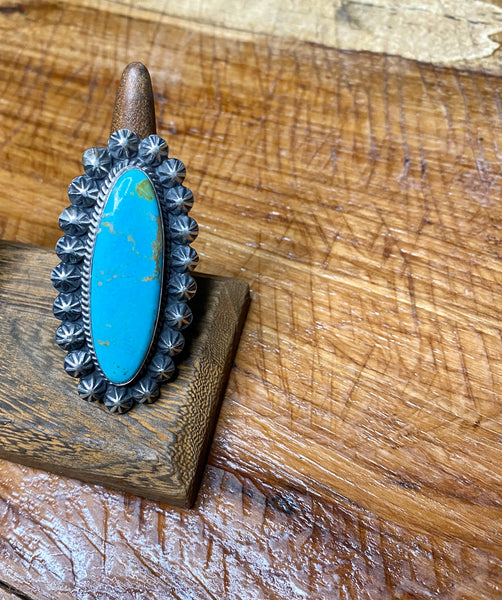 The Miss is an oblong turquoise ring with starburst stamping on the edges