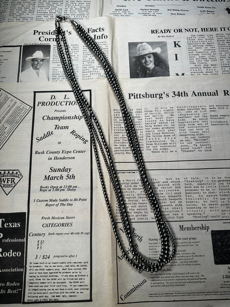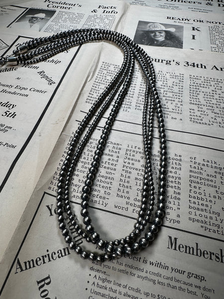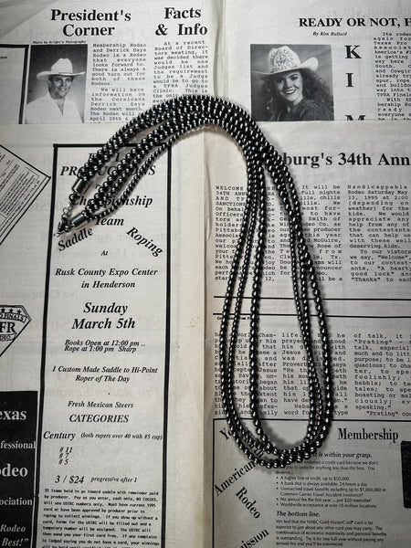 The Bow is a 3 strand of 4, 5, and 6 mm pearls. 36" long and the perfect big statement.