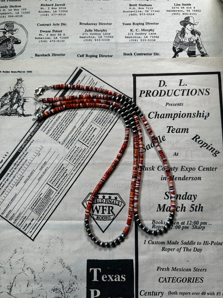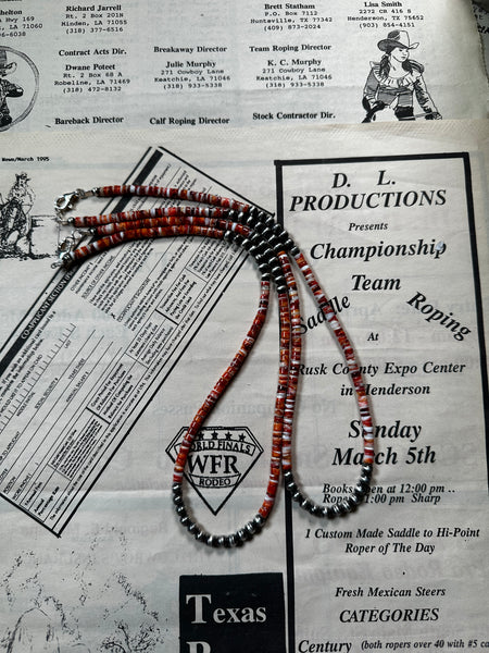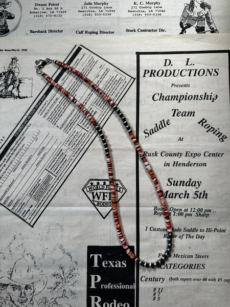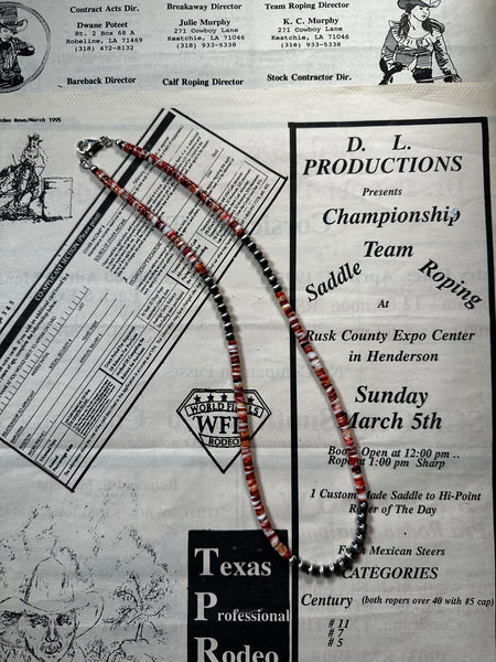 The Taos is a 20" 3mm navajo pearl and spiny oyster necklace