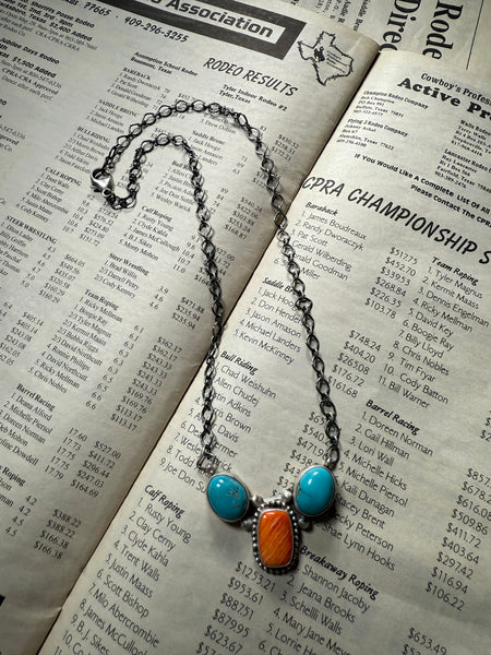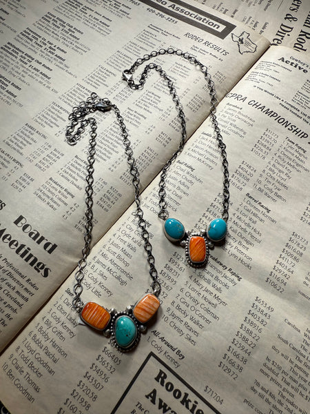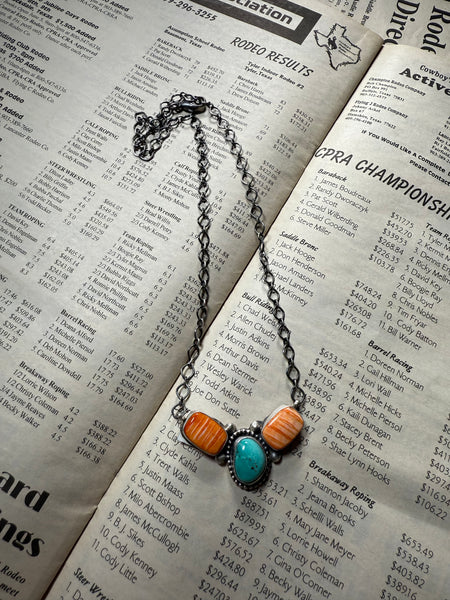 The Chavez is a 3 stone turquoise and spiny oyster necklace 18” at the longest with the ability to be worn shorter
