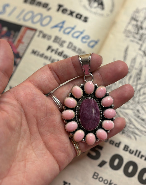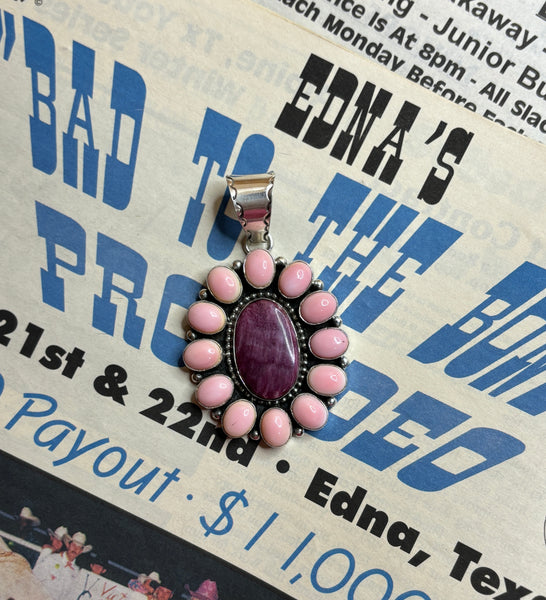 The Santiago is a pink conch & purple spiny oyster cluster pendant