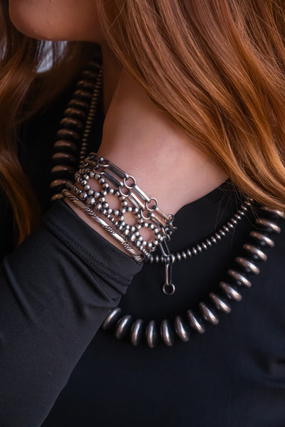 Each bead is expertly oxidized and polished to create a deep, radiant finish reminiscent of traditional Navajo pearls, but with a modern edge.